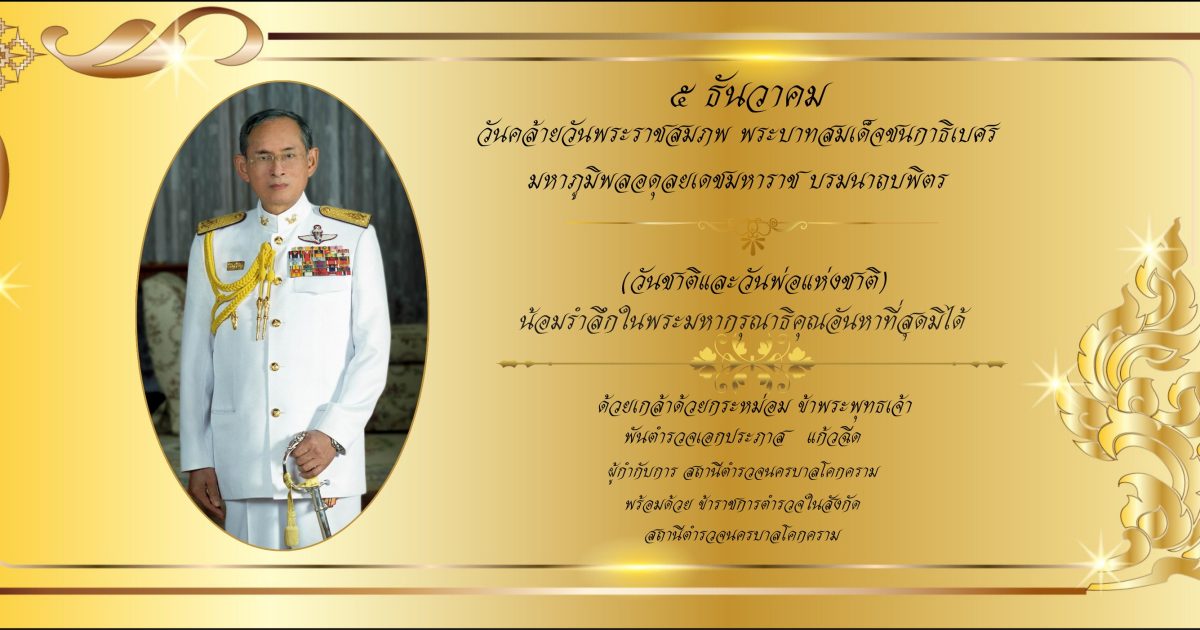 ด้วยวันพฤหัสบดีที่ 5 ธันวาคม 2567 และของทุกปี เป็นวันคล้ายวันพระราชสมภพ พระบาทสมเด็จชนกาธิเบศร มหาภูมิพลอดุลยเดชมหาราช บรมนาถบพิตร (วันชาติและวันพ่อแห่งชาติ) ข้าราชการตำรวจ สถานีตำรวจนครบาลโคกคราม ร่วมน้อมรำลึกในพระมหากรุณาธิคุณอันหาที่สุดมิได้ ด้วยเกล้าด้วยกระหม่อม ขอเดชะ