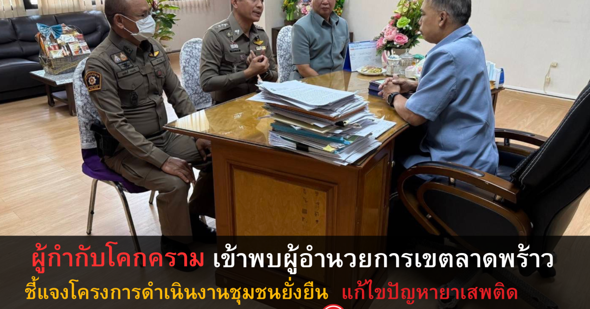โครงการดำเนินงานตชุมชนยั่งยืน เพื่อแก้ไขปัญหายาเสพติดแบบครบวงจรตามยุทธศาสตร์ชาติ ประจำปีงบประมาณ 2568 31 มกราคม 2568 โดย adminkhokkram / ข่าวภารกิจผู้บังคับบัญชา,ไม่มีหมวดหมู่,ผลการปฏิบัติงานของแต่ละสายงาน,งานป้องกันปราบปราม,ป้องกันปราบปราม(ม.ค.68) วันที่ 31 ม.ค. 2568 เวลา 09.30 น. พ.ต.อ.ประภาส แก้วฉีด ผกก.สน.โคกคราม พ.ต.ต.ธนศักดิ์ ดวงแก้ว สวป.(ชส)สน.โคกคราม พร้อมชุด ตชส.สน.โคกคราม เข้าพบผู้อำนวยการเขตลาดพร้าว เพื่อประชาสัมพันธ์และชี้แจงโครงการดำเนินงานตชุมชนยั่งยืน เพื่อแก้ไขปัญหายาเสพติดแบบครบวงจรตามยุทธศาสตร์ชาติ ประจำปีงบประมาณ 2568 โดยเลือกชุมชนเฟรนชิฟ แขวงลาดพร้าว เขตลาดพร้าว กทม. เป็นชุมชนในการดำเนินการตามโครงการ FacebookFacebookXXLINELine